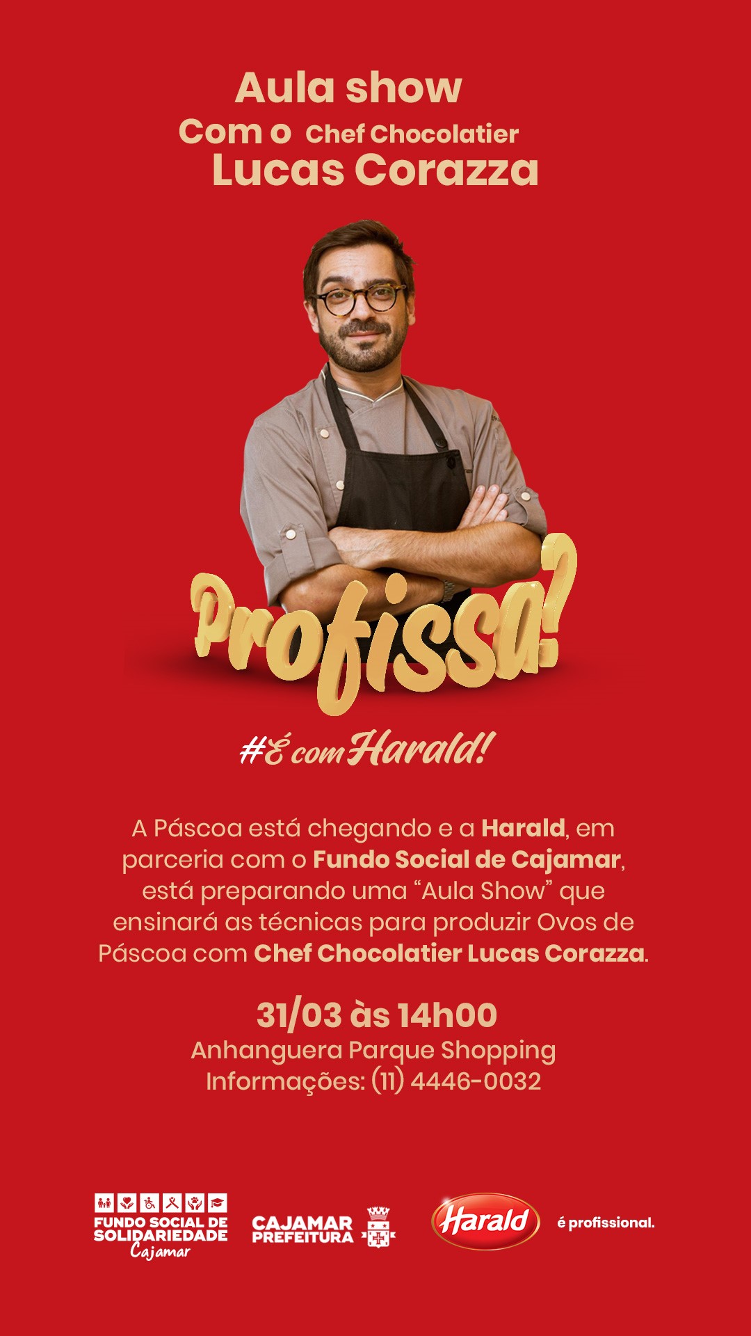 A simpatia do chef conquista seus ouvintes e alunos. E vai conquistar também os clientes do Anhanguera Parque Shopping. Ele irá ministrar uma “Aula Show de Ovos de Páscoa” para empreendedores do ramo da confeitaria e comunidade em geral no próximo dia 31 deste mês no empreendimento, em parceria com a empresa Harald