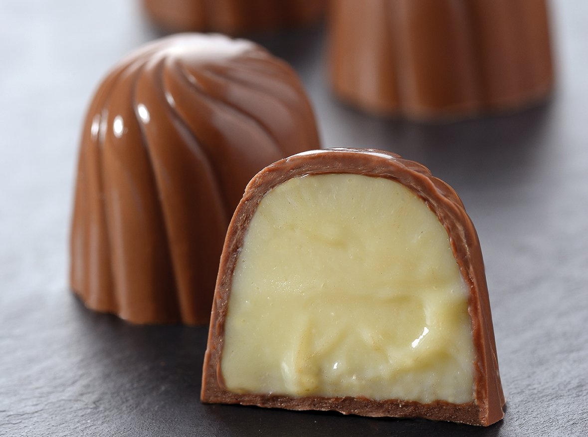 Coloque-o dentre do saco de confeitar e leve à geladeira até que fique firme. Casquinha: Preencha um molde para bombons com o chocolate temperado e dê algumas batidinhas para eliminar as bolhas de ar.