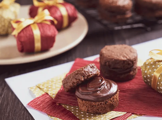 - Assim que formar uma casquinha seca sobre os discos de massa, junte os dois com a ganache. Desse modo, deixe sempre o lado com a calda exposto.