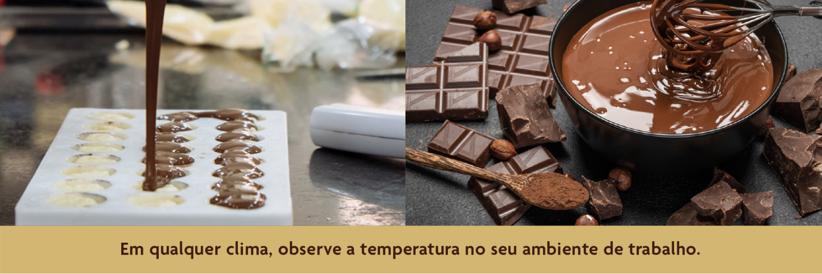 Para trabalhar com chocolate: o ideal é usar ar-condicionado. Na falta dele, prefira lidar com o ingrediente à noite, de preferência em um ambiente que não tenha recebido sol o dia todo. Ligue o ventilador. Ao tirar as peças cristalizadas da geladeira, coloque um refratário por cima; se for molde de bombom, mantenha emborcado, com os doces protegidos lá dentro. O “suor” (ou seja, a condensação gerada pela diferença de temperatura entre a geladeira e o ambiente externo) acontece primeiro no molde e poupa, em parte, a peça cristalizada, que volta aos poucos à temperatura ambiente.