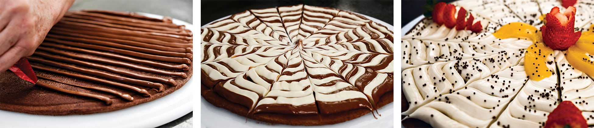 Dessa forma, o profissional precisa apenas aquecer o produto, cortar a ponta da manga e aplicar o produto sobre a massa quente. Uma embalagem é suficiente para o preparo de 4 pizzas grandes ou 7 pequenas (brotinhos). Assim, o recheio espalha-se facilmente sobre a pizza assada, permitindo a criação de decorações especiais, arabescos e marmóreos, combinando as cores dos chocolates. Forma ainda a base para decoração com frutas frescas ou secas, crocantes, amendoim, nozes e castanhas.