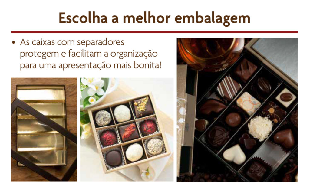Use as características dos ingredientes para criar um manual de degustação que apresente e descreva a proposta de cada um dos seus doces. É esse manual que, além de destacar os seus cuidados na hora de preparar trufas e bombons, vai ajudar o dono da caixa a decidir por onde começar!