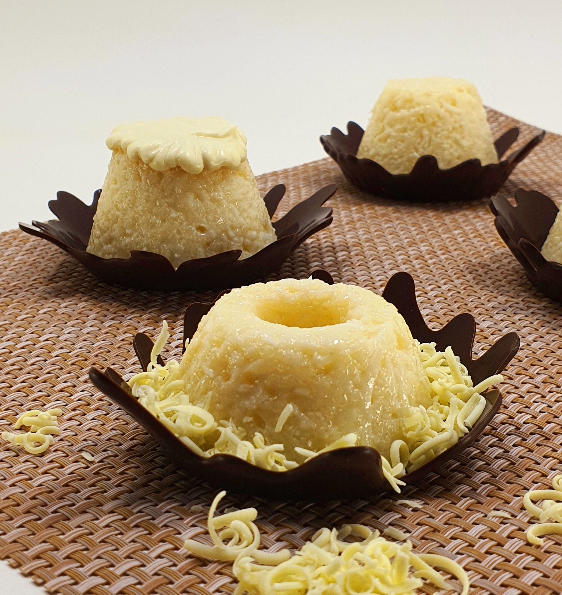 Mix the tapioca and sugar, gradually adding the hot milk. When it starts to get creamy, let it rest for 10 minutes, as the tapioca will grow and become a little firm. Then mix the grated coconut, coconut milk and condensed milk, always stirring. Place in the refrigerator to cool quickly. Finally, mix the Melken White Chocolate (grated and chilled). Grease mini muffin tins or mini cakes with a little olive oil or a mold release agent. Put the dough in the molds, cover with PVC film and take to the fridge for 3 to 4 hours. Remove from the fridge, unmold and serve with the white ganache.
