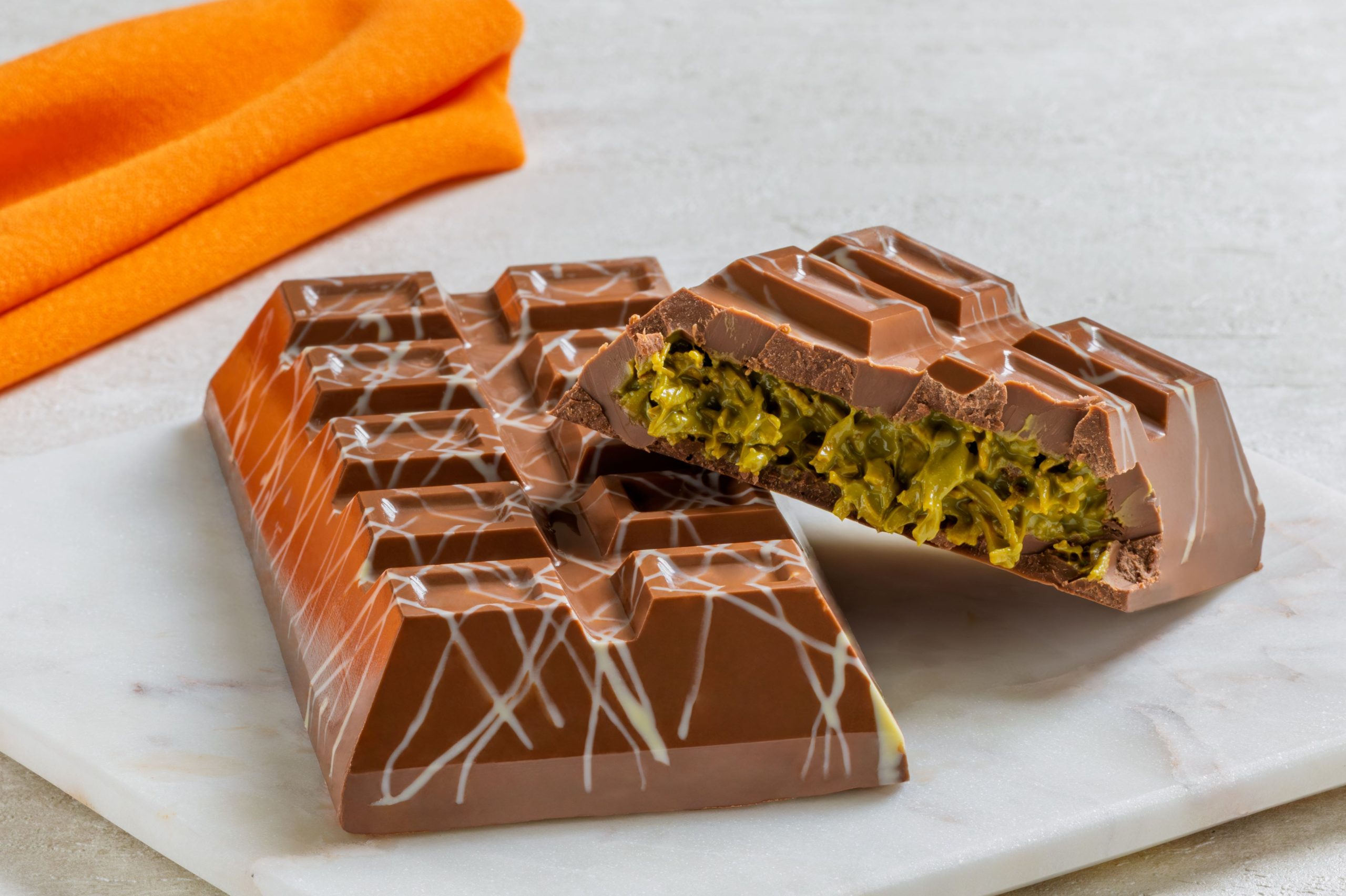 - Recheie os moldes com o Creme de Pistache Dubai e leve à geladeira por 10 minutos para cristalizar.