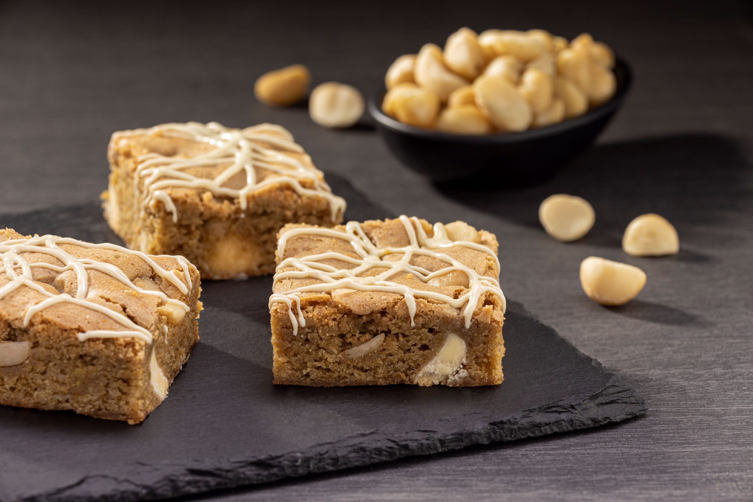 5. Além disso, salpique gotas de chocolate branco 35% Unique e também macadâmias picadas sobre a superfície da massa.