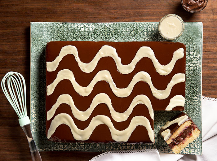 Cobertura: coloque o bolo delicadamente sobre uma grade. Posicione as tiras de acetato na superfície do bolo, formando o desenho da calçada de Copacabana. Aqueça o Creme Ganache sabor Chocolate com Avelã Melken até ficar líquido e despeje sobre o bolo. Leve à geladeira por cerca de 20 minutos para secar e, depois, retire as tiras de acetato delicadamente. Aqueça o Creme Ganache sabor Chocolate Branco Melken, coloque em um saco de confeitar e preencha os espaços das fitas. Leve o bolo novamente para a geladeira por cerca de 15 minutos.