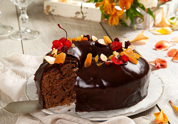Finalização e decoração: despeje a ganache sobre o bolo e decore com os frutos secos e as cerejas picadas.