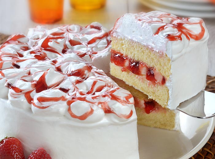 Monte o bolo: corte o bolo ao meio e molhe as duas metades com o leite. Recheie uma delas com o creme de limão e o Recheio de Frutas Vermelhas alternados. Coloque a segunda metade do bolo por cima da primeira e cubra o bolo com o marshmallow utilizando uma espátula. Adicione mais marshmallow no topo do bolo utilizando duas colheres de sobremesa.