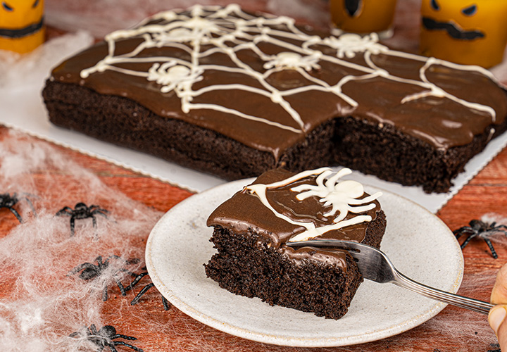 Finalização: com o bolo assado e frio, espatule o creme na superfície. Derreta o Top Branco e coloque em um cone de papel-manteiga. Faça as decorações em forma de teia sobre o bolo. Sobre uma folha de acetato, desenhe pequenas aranhas. Leve as aranhas para cristalizar em geladeira e coloque sobre o bolo na hora de servir.