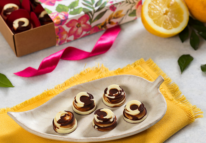 Bombons: Lustre a forma que for utilizar. Derreta e tempere 50 g do Unique Bahia 53% e no fundo da forma, faça uma decoração em formato de vírgula com leve rapidamente à geladeira para cristalizar.