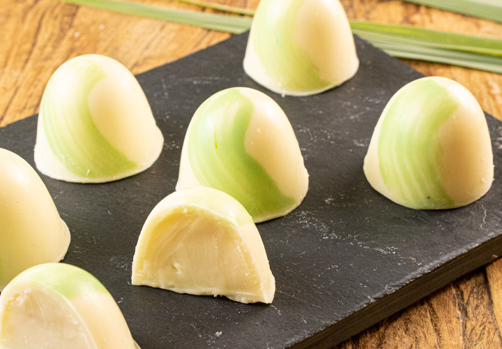 Derreta e tempere o chocolate, separando 3 colheres de sopa. Misture o corante verde à pequena quantidade até atingir a coloração desejada. Pincele o chocolate colorido nas cavidades de uma forma de acetato para trufas e leve para cristalizar.