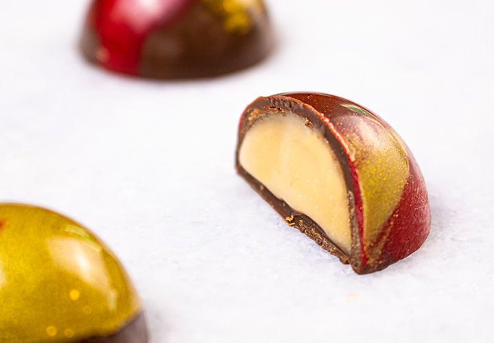 Derreta e tempere o Melken Meio Amargo, faça as casquinhas do bombom por cima das decorações e refrigere para cristalizar. Recheie cada cavidade com a ganache, leve à geladeira para firmar. Feche com chocolate temperado, deixe cristalizar completamente e, quando descolar do molde, desenforme.