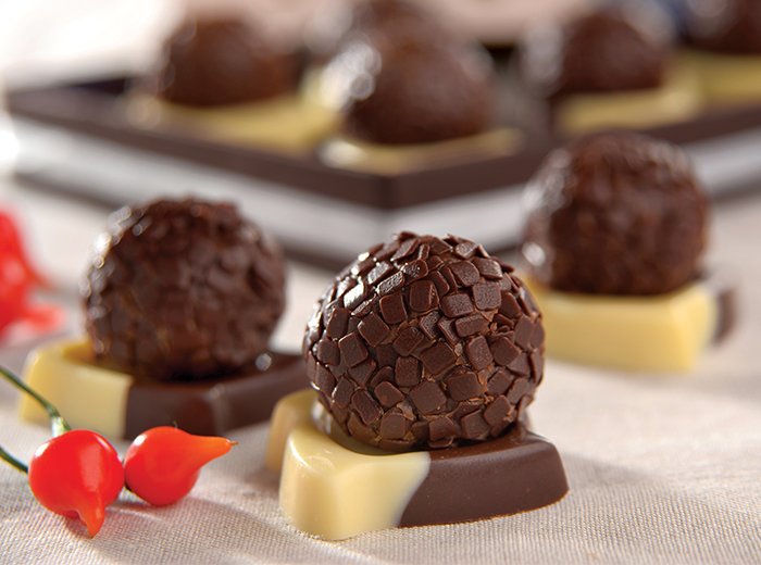 Montagem: unte as mãos com um pouco de manteiga e abra uma porção de brigadeiro em uma das palmas. Disponha uma pimenta no centro do brigadeiro e feche-o de modo a envolver toda a pimenta. Passe o brigadeiro recheado no granulè e pingue uma gotinha do chocolate temperado na plaquinha para colar o brigadeiro.