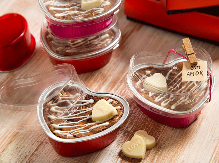 Coloque o chocolate branco temperado reservado em um cone de papel-manteiga, faça traços na superfície do brownie e leve à geladeira por alguns instantes para secar. Finalize colocando 1 coração de chocolate branco em cada unidade. Tampe e mantenha as embalagens em local fresco, ao abrigo da luz e de aromas fortes.