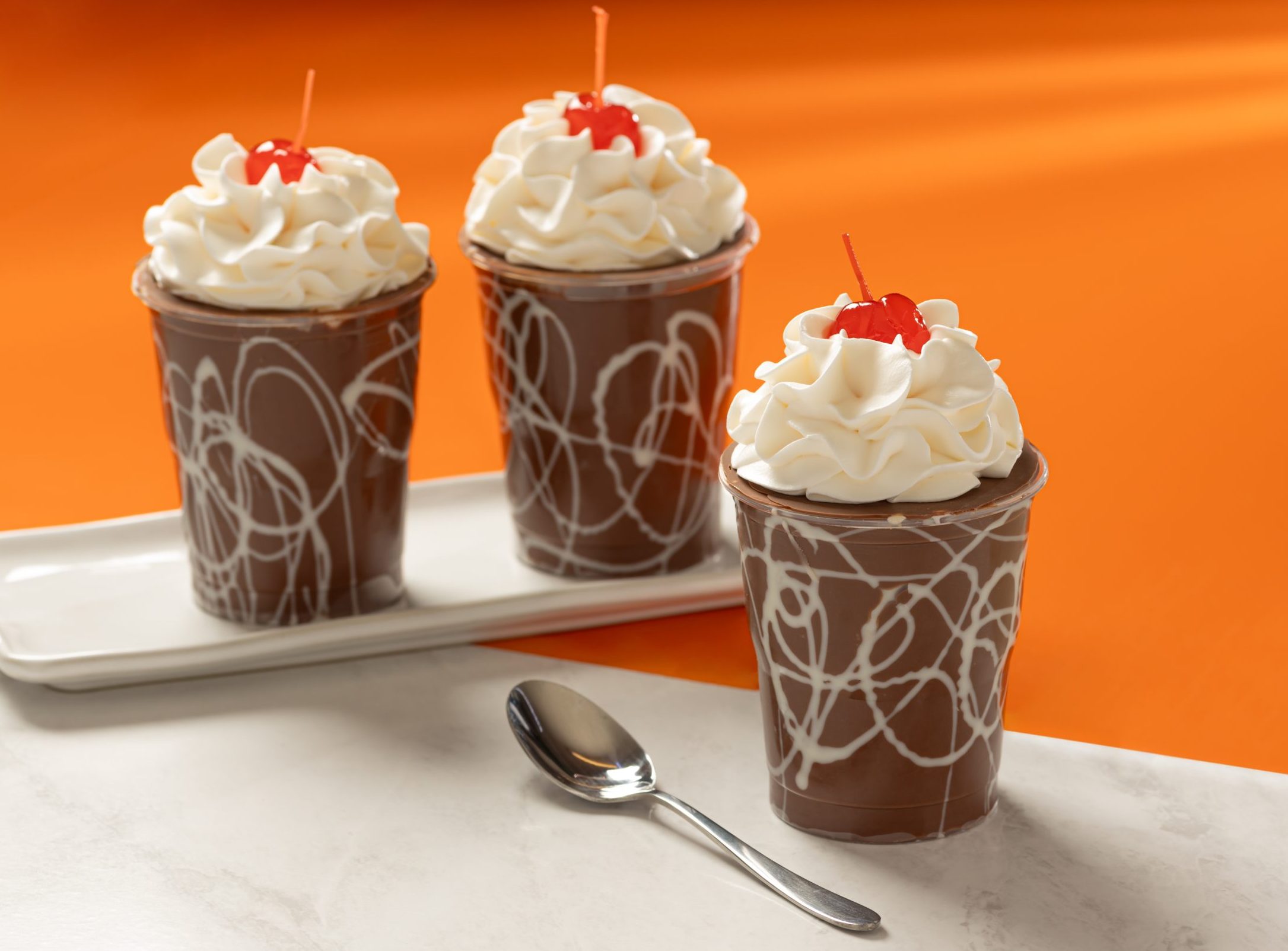 - Utilize o cone ou cartucho de papel para fazer desenhos aleatórios no interior de cada copo com a Cobertura TOP Branco. Depois, leve os copos à geladeira por cerca de 5 minutos, ou até que a cobertura cristalize.