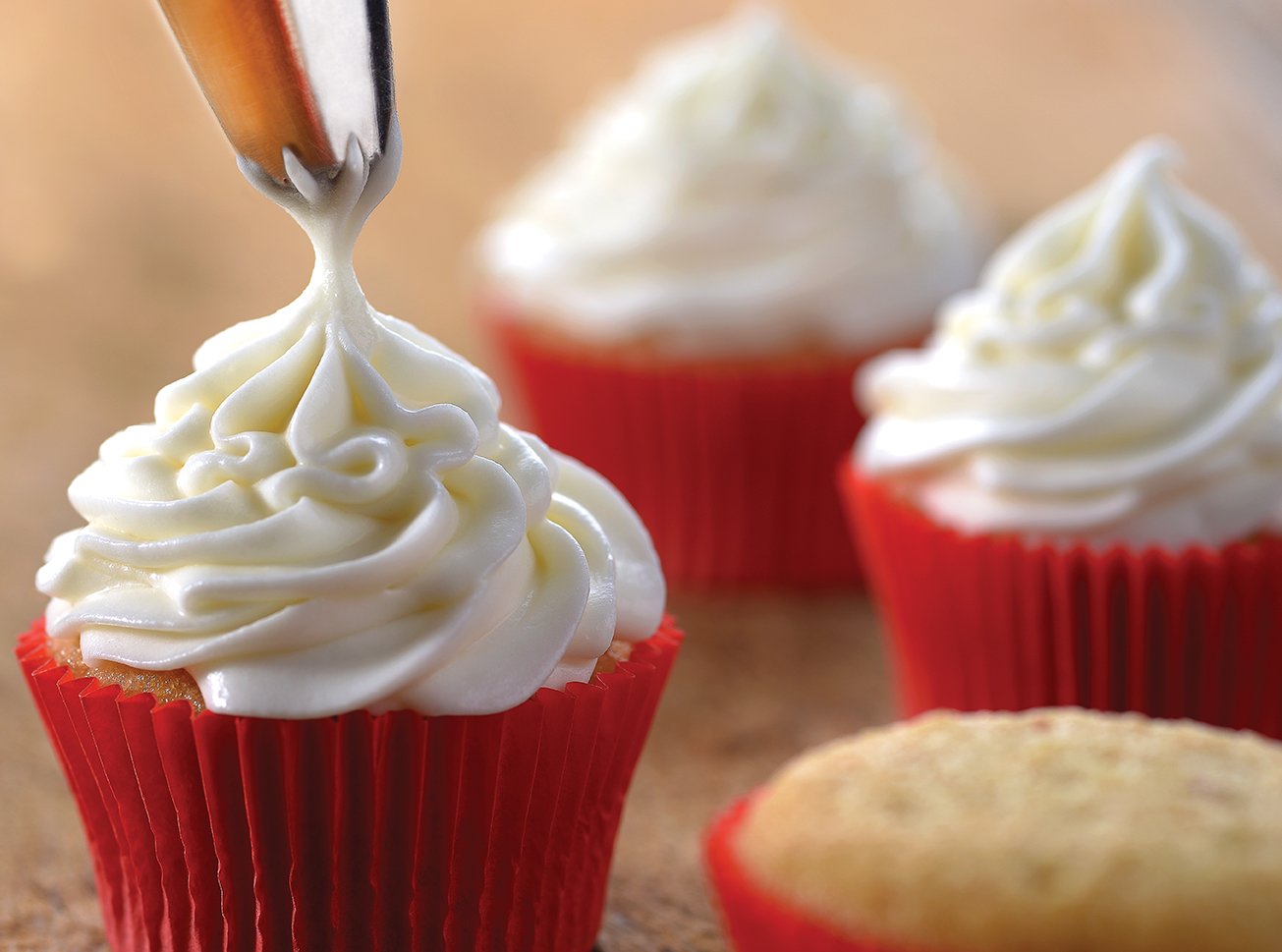 Retire a mistura de Confeiteiro e leite desnatado da geladeira e bata em velocidade alta até dobrar de volume. Cubra os cupcakes com o Chantilly de Chocolate e finalize com amendoim granulado.
