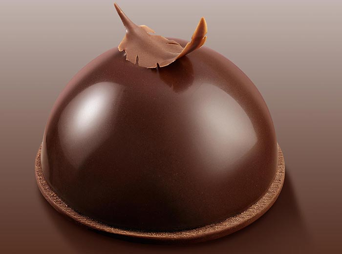 Discos de chocolate: espalhe o chocolate restante sobre uma folha de acetato lisa ou texturizada e leve à geladeira por cerca de 3 minutos ou até que o chocolate esteja seco ao toque, porém ainda macio. Corte discos com o cortador de 8 cm, leve à geladeira novamente por mais 15 minutos e destaque os discos da folha de acetato. Desenforme as meias esferas delicadamente, coloque-as sobre os discos e finalize com uma decoração de chocolate.