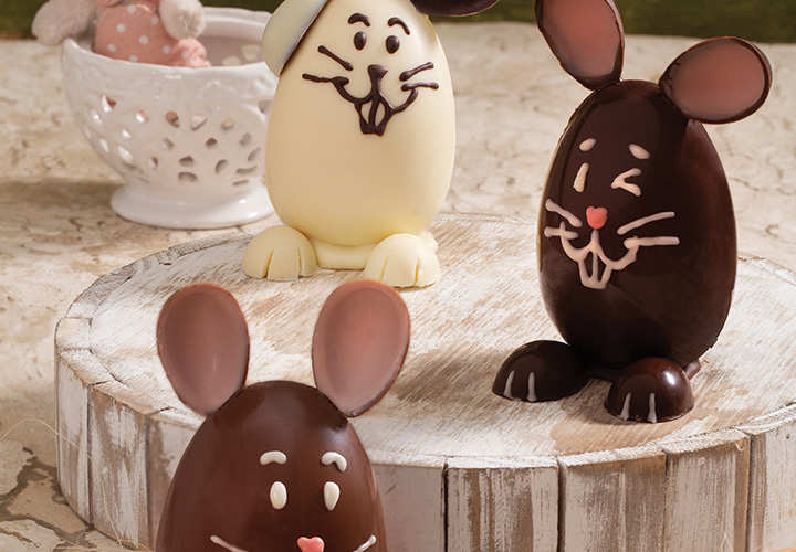 Pingue três gotas de Melken Ao Leite temperado sobre uma placa forrada com papel-manteiga e, antes de secar, encaixe os corpos e as patinhas para firmar a base. Faça mais dois pingos de Melken Ao Leite temperado na parte superior de cada corpo, aqueça a base das orelhinhas rapidamente sobre uma superfície quente e cole no chocolate. Leve à geladeira por 5 minutos para cristalizar. Disponha os coelhinhos em caixinhas de acetato e finalize com um laço.