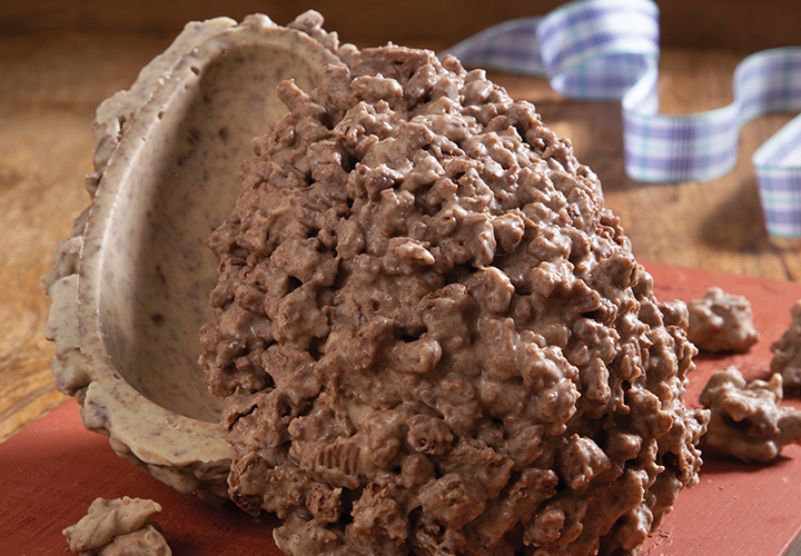Reaqueça o chocolate restante a 31 °C e misture com os pedaços maiores de biscoito. Use colheres para espalhar a mistura na superfície externa das cascas. Com as sobras, faça pequenos montinhos sobre o papel-manteiga, segue em geladeira por 5 minutos e use para rechear o ovo. Feche o ovo e embale em celofane transparente, finalizando com um laço.