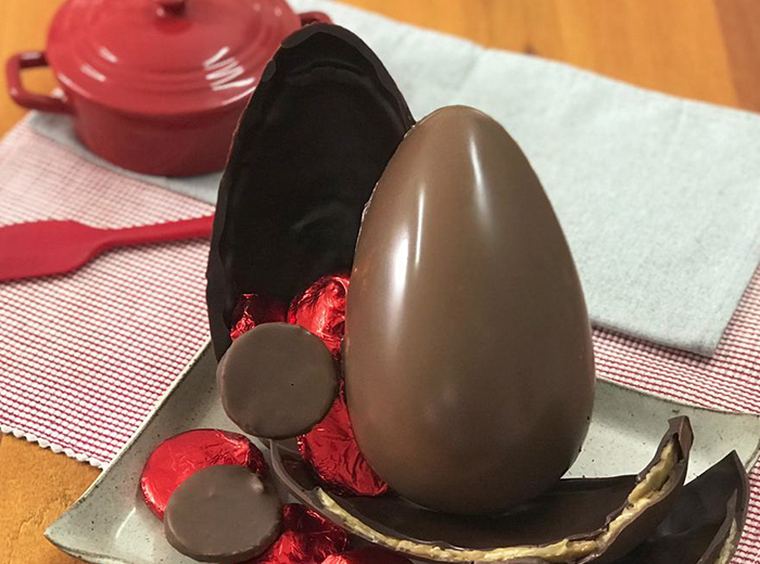 Monte o ovo com as duas cascas já cristalizadas e recheie com bombons preparados com o mesmo caramelo e banhados nos dois chocolates Melken Belga.