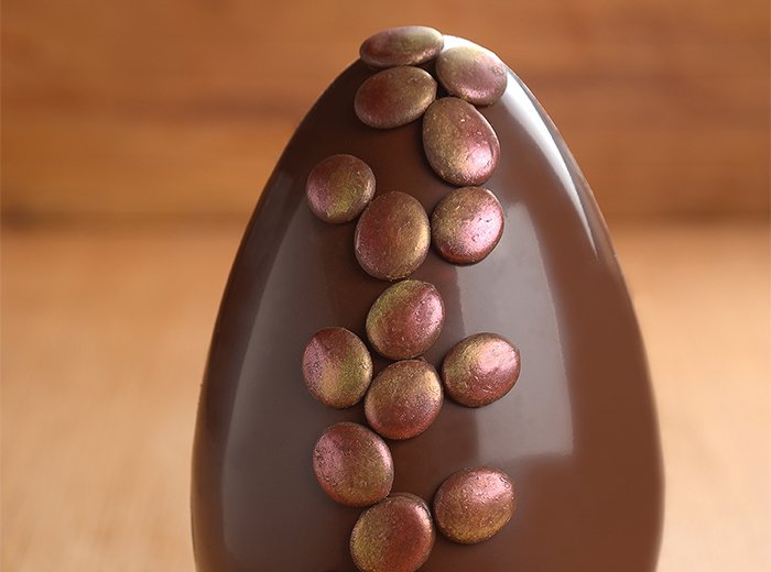 Enquanto isso, prepare os bombons para rechear o ovo reserve uma pequena porção do chocolate que restou para colar a decoração. Verifique a têmpera e misture o granulado crocante, o cravo e a canela. Despeje o chocolate no molde para bombons e leve-os à geladeira por cerca de 20 minutos. Desenforme as cascas dos ovos e dos bombons. Com as pontas dos dedos, esfregue as gotas de chocolate reservadas para a decoração para que fiquem uniformes. Aqueça o chocolate reservado para a decoração, coloque-o em um cone de papel-manteiga e cole as gotas na superfície do ovo, dando o formato desejado – curva, ramo de árvore, flor etc. Com a ponta do dedo, pegue um pouco de corante e passe rapidamente sobre as gotas de chocolate já coladas. Una as cascas com os bombons dentro, embale o ovo com celofane transparente e feche com um laço.