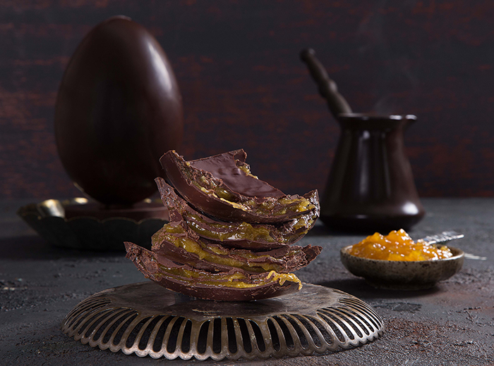 Derreta e tempere o Unique Bahia 63% e, com uma forma de acetato para cascas de 250 g, molde uma camada da casca e leve à geladeira para cristalizar.