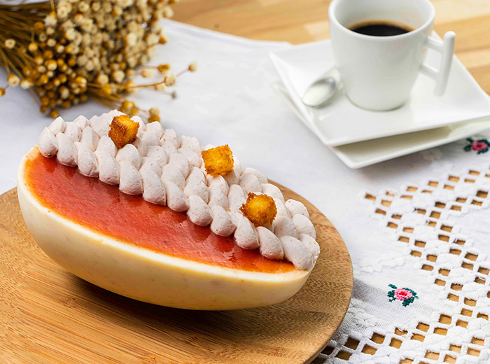 Coloque o restante da mousse em um saco de confeitar e decore uma metade da casca. Posicione os cubinhos de bolo de fubá tostados sobre a decoração de mousse.