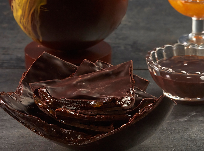 Derreta e tempere o chocolate: derreta o chocolate em banho-maria ou micro-ondas (potência 50%), mexendo de vez em quando. Faça a têmpera, movimentando o chocolate até atingir 28°C a 29°C. Reaqueça ligeiramente para chegar à temperatura de trabalho (31 °C a 32 °C).