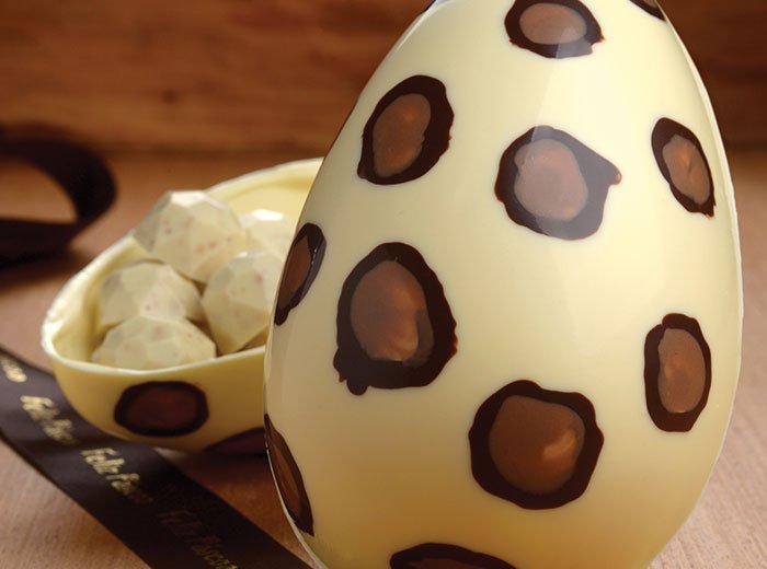 Faça os bombons aproveitando o excesso do Inovare Branco vertido no refratário após a moldagem das cascas. Adicione a pimenta-rosa, o amendoim e o gengibre e misture bem. Despeje em forminhas para bombons, dê algumas batidinhas para tirar as bolhas e leve à geladeira até que o molde esteja opaco. Desenforme as cascas dos ovos e os bombons. Monte os ovos, embale-os com celofane transparente e feche com uma fita de cetim.