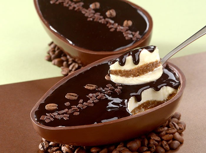 Casca: derreta completamente o chocolate em calor suave e tempere-o. Molde as cascas despejando o chocolate temperado até a marca indicada nas formas, de acordo com as instruções do fabricante. Leve-as à geladeira com a boca virada para baixo, por cerca de 20 minutos ou até que os moldes estejam opacos. Desenforme.