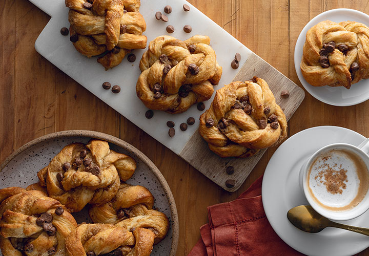 Modelagem: dobre a massa à metade, no sentido do comprimento, unindo as duas pontas com o maior lado do retângulo. Corte na metade e, depois, cada metade em duas partes e assim por diante, até obter 16 fatias. Estique e torça cada fatia e faça um nó com a massa, unindo as duas pontas, deixando-as viradas para baixo. Decore com o restante das gotinhas Chipshow Avelã. Deixe fermentar por cerca de 20 minutos. Leve para assar em forno pré-aquecido a 180 °C.