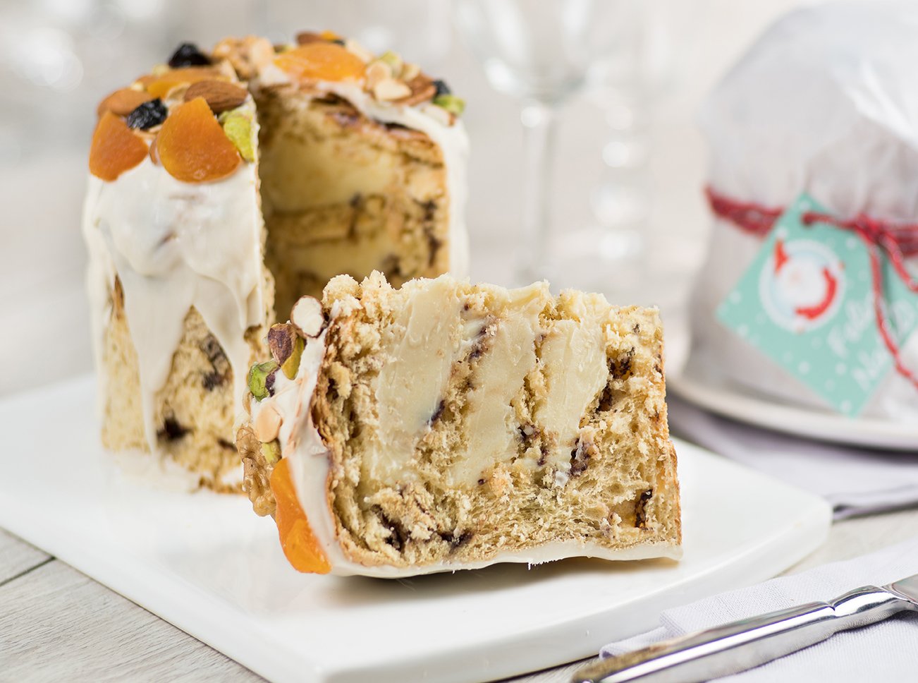 Finalização: derreta e tempere o chocolate branco. Coloque o panetone em um prato, espalhe o chocolate branco sobre ele e decore com as frutas e as oleaginosas.
