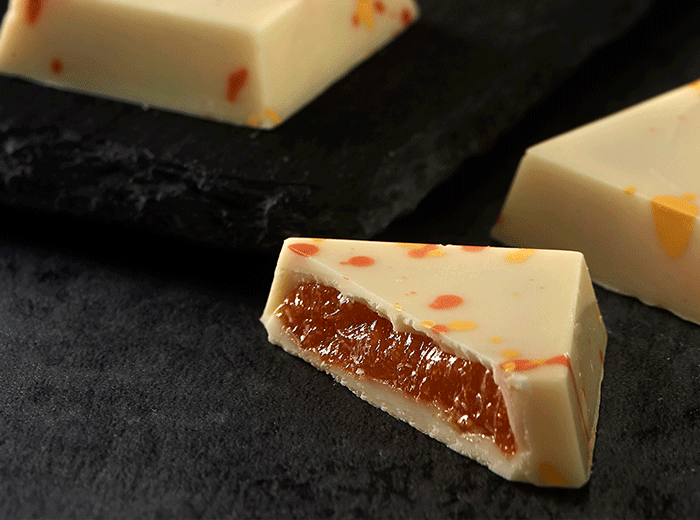 Faça os bombons: distribua o chocolate temperado sobre os moldes decorados, dando ligeiras batidinhas para retirar as bolhas de ar. Vire-os sobre um refratário, para recolher o excesso. Limpe a superfície do molde com uma espátula e leve à geladeira por alguns minutos, apenas para secar a parte interna das casquinhas. (link para a técnica de preparo das casquinhas) Retire da geladeira, aplique o recheio de damascos, deixando 1 mm de espaço das bordas. Cubra com o restante do chocolate recolhido (verifique se ainda está na temperatura de trabalho, antes de aplicar. Se necessário, aqueça por alguns segundos) e volte à geladeira para cristalizar completamente, por cerca de 25 minutos.