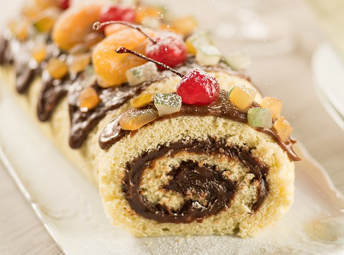 Finalização: disponha o rocambole em uma travessa, espalhe o recheio com o licor na superfície e decore com as frutas e as oleaginosas. Polvilhe o açúcar impalpável com a ajuda de uma peneira e leve à mesa de doces da ceia de Natal.