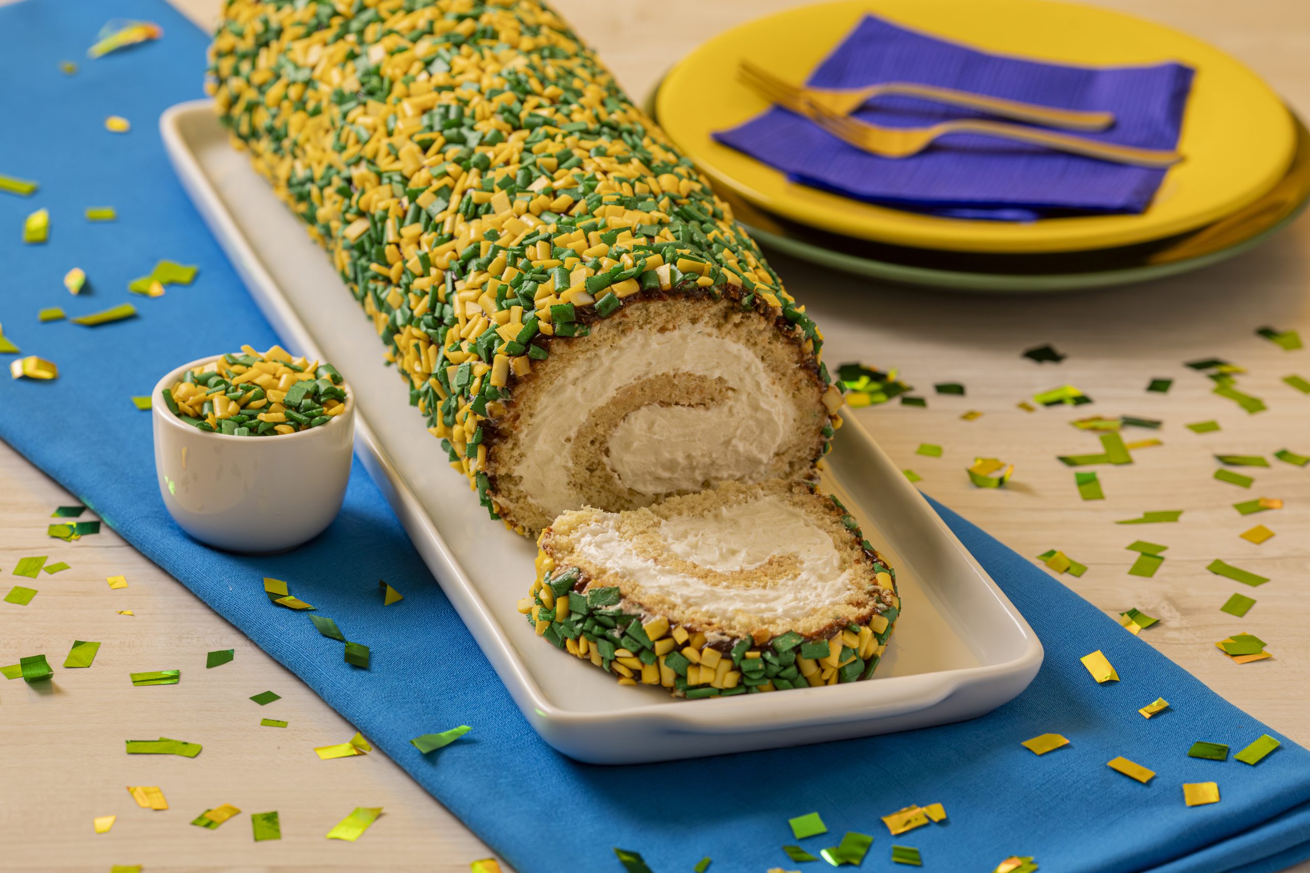 Polvilhe açúcar sobre uma folha de papel manteiga e desenforme a massa ainda morna sobre ela. Espalhe uniformemente o recheio tropical sobre a massa e enrole cuidadosamente, formando o rocambole e então leve à geladeira por 1 hora para firmar e cubra o rocambole com Brigadeiro Pronto Melken, espalhando bem para que sirva de cola para os confeites. Finalize decorando com Confeité TOP Verde e Amarelo sobre a cobertura.