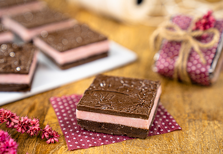 Com as placas recém cristalizadas, corte quadrados de 4 cm para acomodar o recheio já cortado, entre duas camadas de cobertura, como um sanduíche.