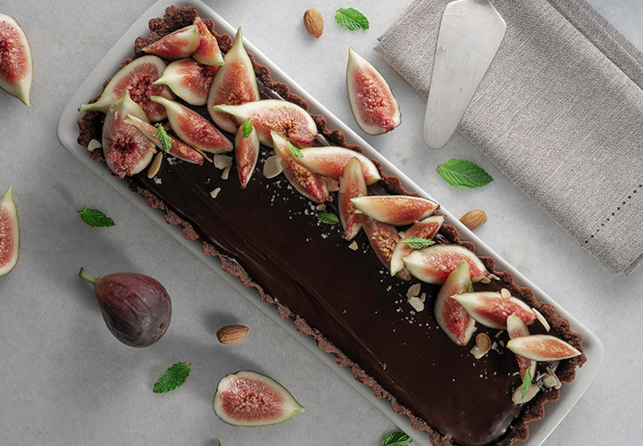 Na hora de servir, corte os figos em quartos e disponha sobre a torta, formando um caminho lateral com as folhas de hortelã, amêndoas laminadas e flor de sal.
