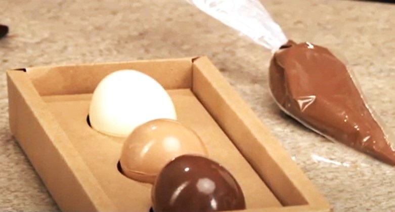 - Por conseguinte, o ovinho de Cobertura TOP Avelã, será recheado uma das cascas com Creme Ganache Melken sabor Chocolate com Avelã e a outra com Recheio e Cobertura Melken sabor Leitinho. Assim, repita o procedimento do ovinho anterior para fechá-lo.