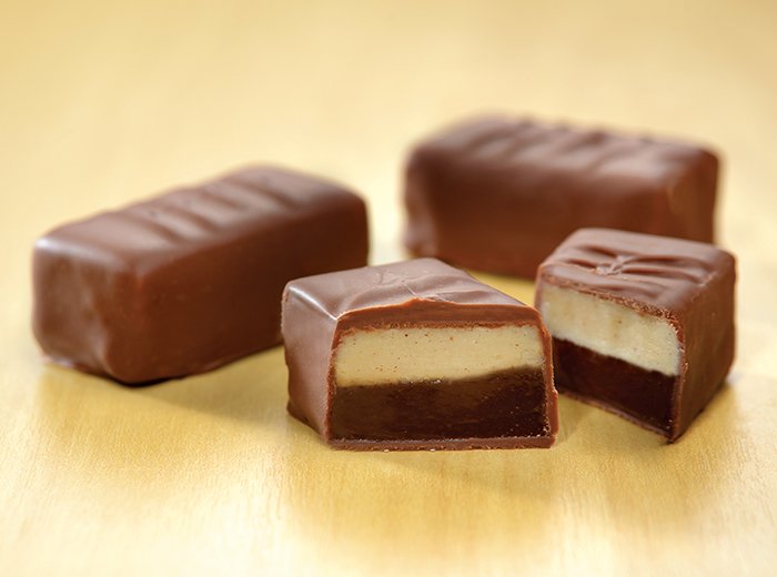 Retire o refratário da geladeira e solte as camadas de trufa solidificadas, puxando o papel-manteiga. Aqueça a lâmina de uma faca grande em água quente, seque-a e corte a trufa em retângulos de 2 cm x 4 cm.
