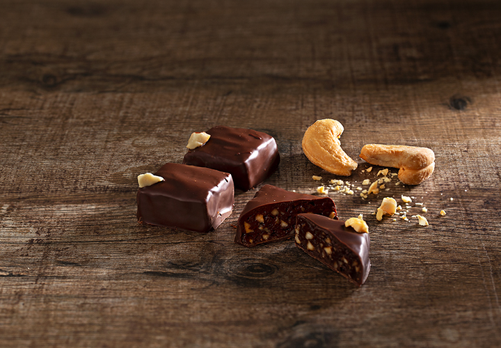 Ganache: derreta e tempere o Unique Bahia 63%. Aqueça o leite a 30 °C e acrescente-o junto com a glucose ao chocolate. Mexa bem para obter um creme homogêneo, acrescente o crocante de caju e misture novamente.
