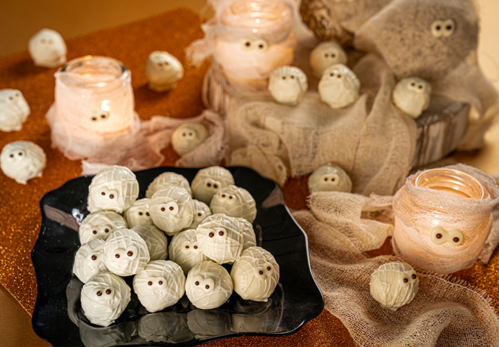 Decoração: derreta o Top Branco e coloque em cone de papel-manteiga. Faça riscos aleatórios em direções diversas nas trufas banhadas, criando o aspecto de uma múmia envolvida em gaze. Leve à geladeira para secar.