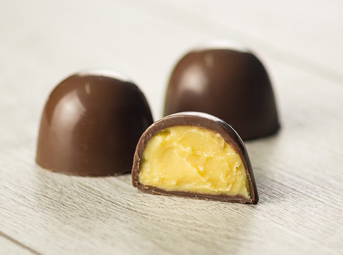 Casquinha: preencha um molde para bombons com a cobertura derretida e dê algumas batidinhas para eliminar bolhas de ar. Em seguida, vire-o sobre o refratário para escorrer o excesso. Leve o molde à geladeira para secar por alguns minutos. Preencha a cavidade do molde com o recheio da manga de confeitar, cuidando para que ele esteja em uma temperatura compatível com a da cobertura. Feche o trufão com o Top Blend derretido. Remova o excesso de cobertura com uma espátula e leve novamente à geladeira por cerca de 20 minutos, ou até que o molde fique opaco, indicando que as trufas podem ser desenformadas. Desmolde, acomode-as em caixinhas de papel e monte caixas para presente.